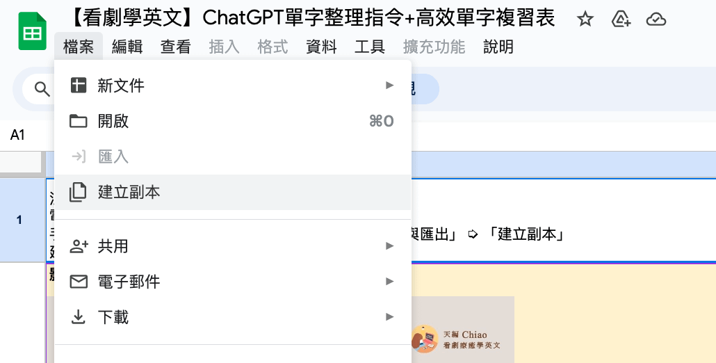 購買模板後到單元章節「步驟一」 ⮕下載此PDF檔(如下圖) ⮕ 點擊PDF檔第一行的「點我到Google Sheet模板」⮕ 到 Google Sheet 表單 ⮕ 再點選「檔案」「建立副本」即可開始編輯 ⮕ 最後跟著課程章節手把手帶你邊看劇邊操作
